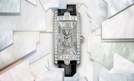 表盤上色彩、質(zhì)地各異的珍珠母貝呈現(xiàn)出極富現(xiàn)代主義風(fēng)格的幾何造型