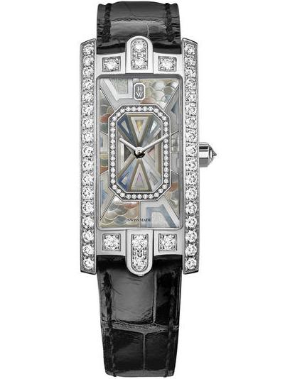 海瑞溫斯頓就是一個很好的例子。品牌今年推出的第五大道Avenue C系列Precious Marquetry腕表表盤上,匯集了多種色彩、質(zhì)地各異的珍珠母貝,包括來自淡水、大溪地、純粉色、純白色、直條壓紋及環(huán)狀壓紋等的珍珠母貝,在光線的流轉(zhuǎn)變換下,散發(fā)出令人沉醉的柔美光暈,構(gòu)成了一幅令人驚嘆的水彩畫作。海瑞溫斯頓從品牌聞名遐邇的珠寶美學(xué)傳統(tǒng)出發(fā),通過精巧的拼接與組合,讓珍珠母貝呈現(xiàn)出極富現(xiàn)代主義風(fēng)格的幾何造型,牽引著人們目光的方向。表盤中心的祖母綠型切工商標(biāo)裝飾有44顆圓形明亮式切工鉆石,鉑金材質(zhì)表殼則飾有43顆圓形明亮式切工鉆石,令整只腕表熠熠生輝。