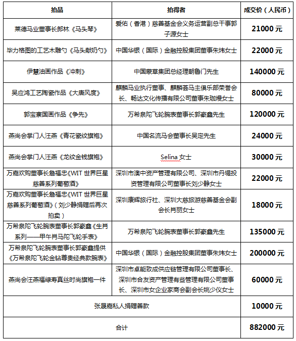 現場,龍麒集團董事長梁超攜麒麟馬業中國區副總裁黃偉東,麒麟馬業執行董事、亞太杰出女性聯合會常務副會長、紫爵傳媒董事長溫瑞玲,三位在臺上妙語連珠,鼓動眾多中國的富豪及華人優秀企業家們積極參與慈善拍賣,溫瑞玲并割愛將自己身穿的燕尚會福綠壽真絲時尚旗袍進行拍賣,開玩笑說:“只要能促進慈善事業的發展,讓我做什么都愿意?!摈梓腭R業執行董事朱珈熳也代表麒麟用80000元人民幣拍下吳應鴻的陶瓷《大唐風度》。麒麟馬業用自己的行動,帶領中國企業家們向世界傳遞中國公益慈善事業。當晚活動共籌得882000元善款,麒麟馬業將晚宴慈善拍賣所得款項全數捐給愛佑慈善基金會,主要用于國內先天性心臟病兒童的手術治療項目。具體拍賣金額列表如下: